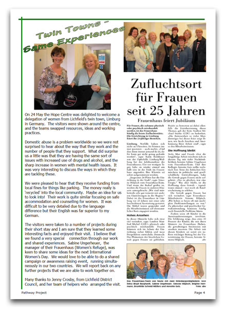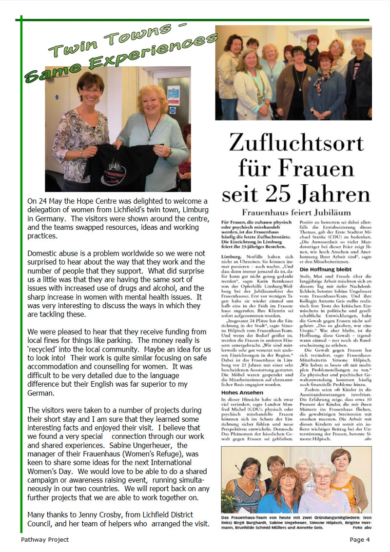 The visitors were taken to a number of projects during their short stay and I am sure that they learned some interesting facts and enjoyed their visit. I believe that we found a very special connection through our work and shared experiences. Sabine Ungerheuer, the manager of their Frauenhaus (Women’s Refuge), was keen to share some ideas for the next International Women’s Day. We would love to be able to do a shared campaign or awareness raising event, running simulta- neously in our two countries. We will report back on any further projects that we are able to work together on.