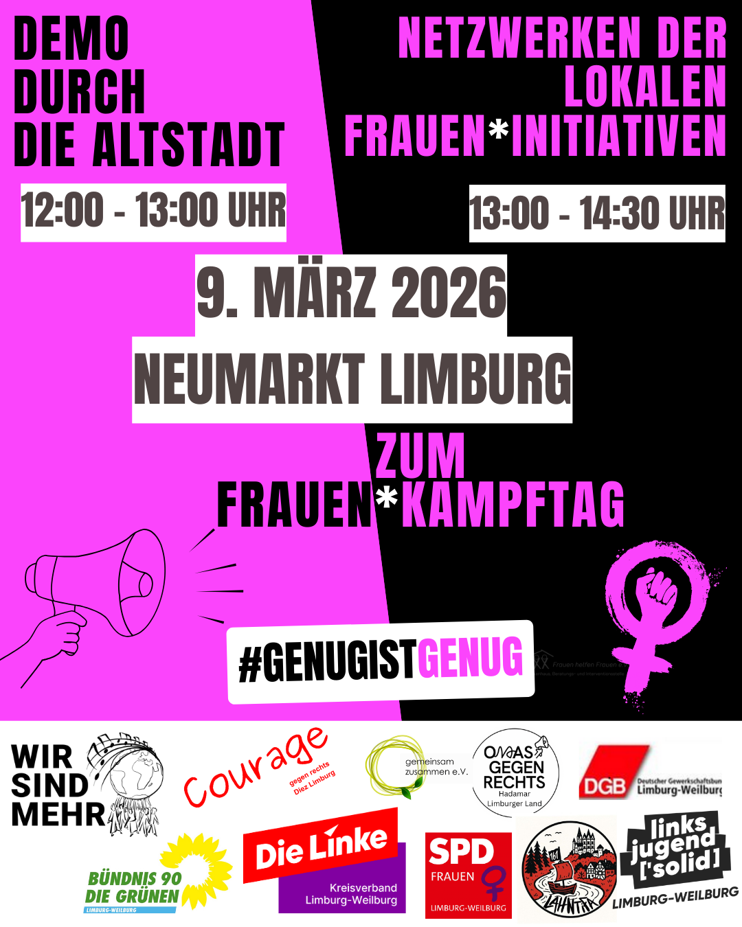 Am 9.3. zwischen 12:00 Uhr und 14:00 Uhr gehen wir anlässlich des Internationalen Frauenkampftags gemeinsam auf die Straße! ✊